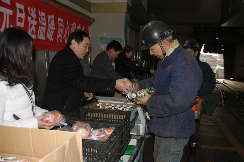 1月1日,太平煤矿工会组织开展了"元旦送温暖  同心唱安全"主题送祝福活动,党委书记汤保民、纪委书记兼工会主席邵作胜亲临活动现场,他们和女工协管员们一起将寓意诚心诚意送平安的甜橙、苹果、香喷喷的油饼、香肠、矿泉水递到一线职工手中,并为坚守在充填站、排矸站、皮带上仓岗位的职工送去了矿党政工领导最温暖的问候和诚挚的祝福,让广大职工感受到了节日的温馨和领导的亲切关怀。